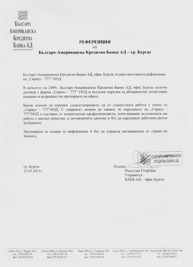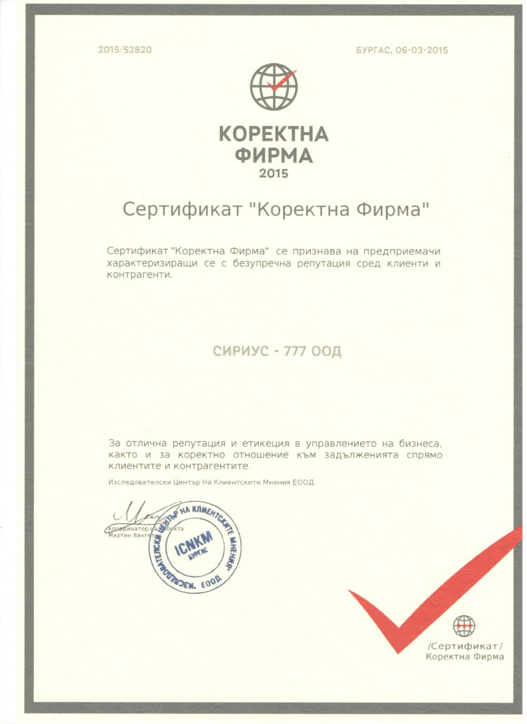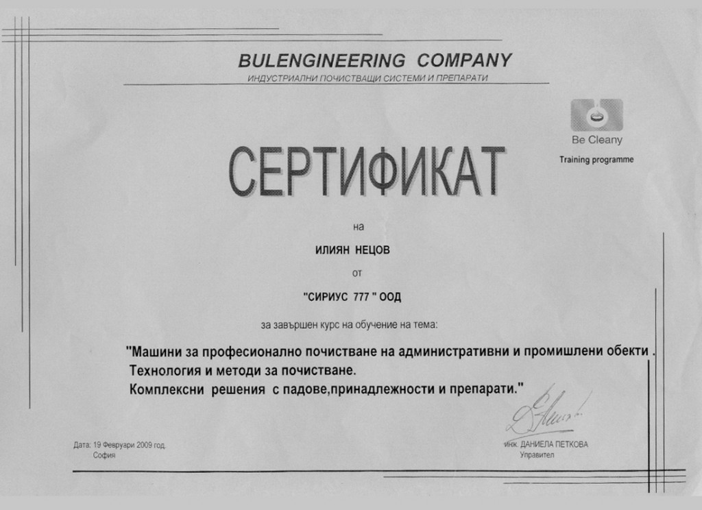 Сириус – 777 ООД е фирма за професионално почистване,основана през 2006г. Основен предмет на дейността на фирмата е комплексно почистване на административни сгради,производственни помещения, халета, офиси, ваканционни селища, казина, банки, хотели, домове, магазини. Извършва почистващи услуги в областите Бургас, Ямбол и Сливен.